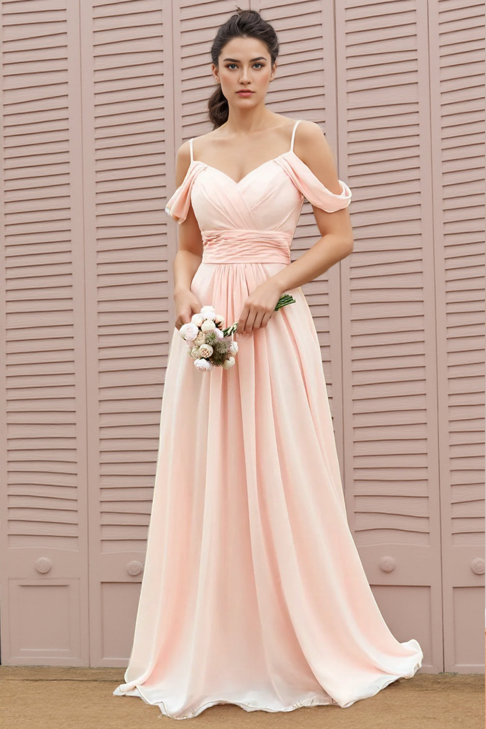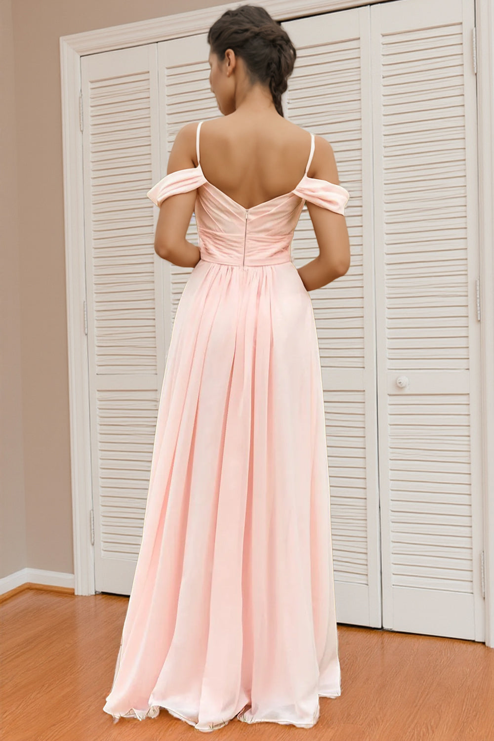 Spaghetti Straps Off Shoulder A-line Chiffon Blush Bridesmaid Dress